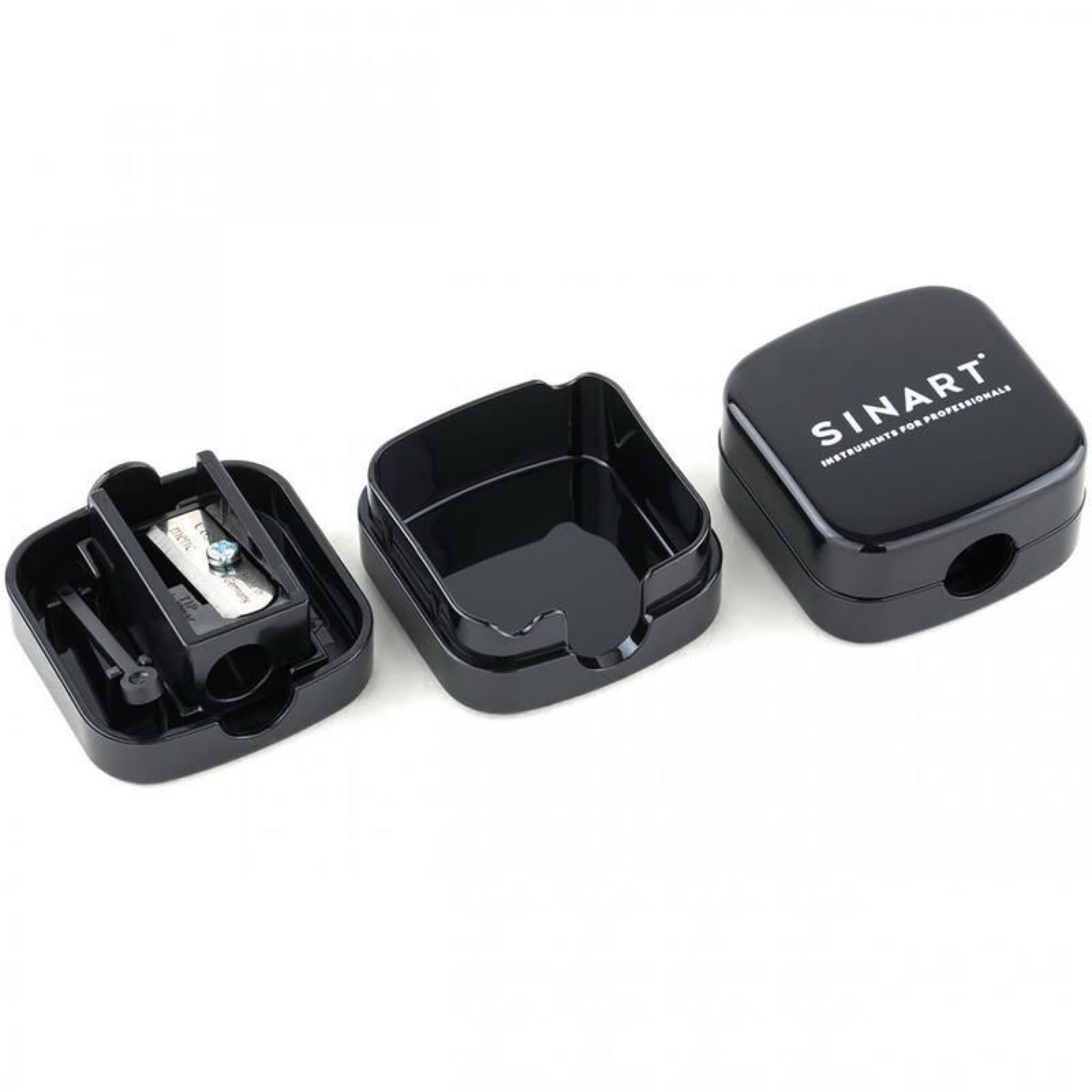 Точилка для олівця SINART. Її леза виготовлені з міцної нержавіючої сталі, завдяки цьому грифельна частина при заточуванні набуває ідеально-гостру форму. Точилка закривається повністю, завдяки цьому стружка не висипається, і в косметичці завжди ідеальний порядок.