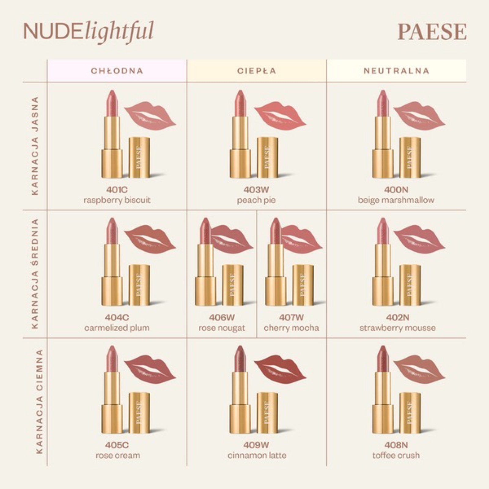Paese NUDElightful - це колекція з десяти кремових помад, що поєднують комфорт використання з сучасними трендами. Кожна помада Paese NUDElightful легко наноситься на губи, забезпечуючи інтенсивне зволоження та відчуття легкості. Ці помади ідеально підходять особам, які віддають перевагу ніжному, але ефектному макіяжу . Завдяки оксамитовій формулі губи набувають природного блиску, який підкреслює їхню красу і надає елегантності.
