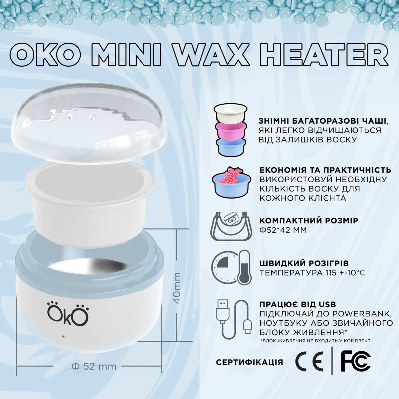 - Воскоплав має сертифікацію CE, FCC.