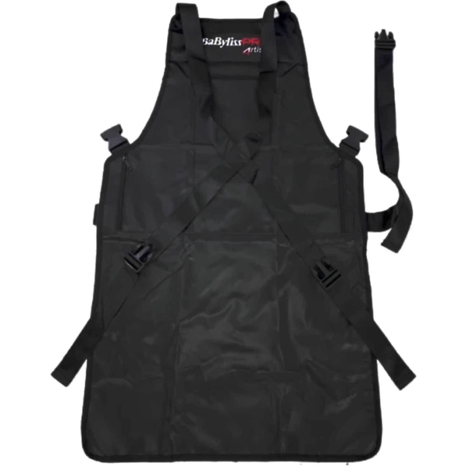 BaByliss PRO M4189E (щільний, чорний) - фартух для перукарських робіт, який захистить одяг майстра від забруднень, зістриженого волосся та сумішей, що фарбують. Підходить для барберів та майстро-універсалів. Виконаний із міцної тканини – спеціальний поліестер із основою з ПВХ. Фартух має вологовідштовхувальні властивості і стійкий до хімічних речовин. Його зручно носити протягом дня та не переживати через забруднення на одязі. Має три кишені на блискавці для дрібних аксесуарів. Кріпиться за допомогою шлейок (2 зверху для кріплення через спину та 1 знизу).