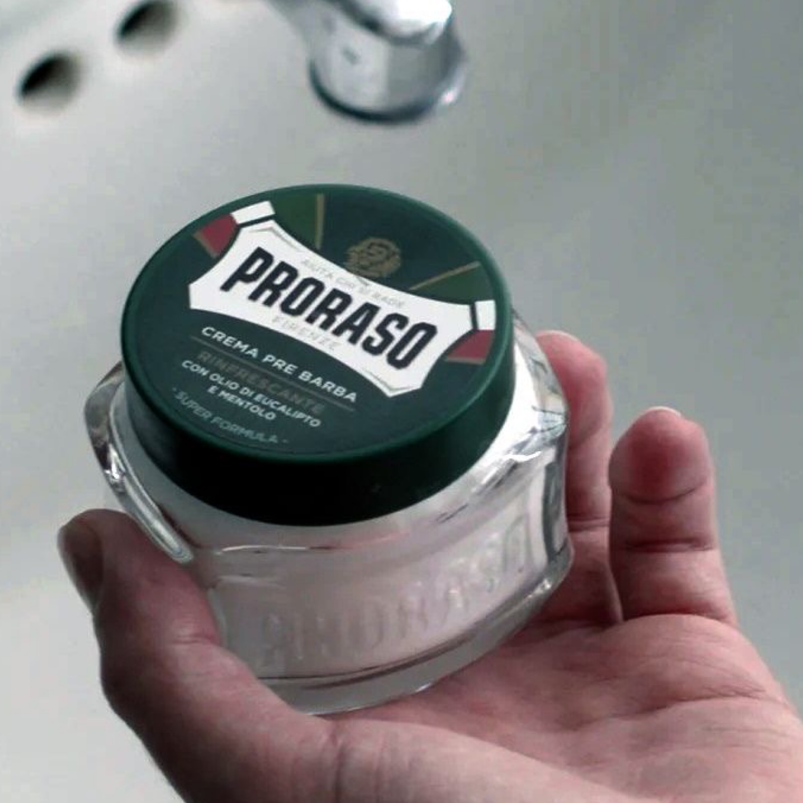 Трохи змочіть обличчя водою та нанесіть на нього необхідну кількість крему. За допомогою пальців легкими круговими рухами втирайте засіб до повного вбирання в ті ділянки шкіри, де відбуватиметься гоління. Не змивайте. Після того, як видалите волосся та змиєте залишки засобу для гоління, на суху шкіру нанесіть ще трохи Refresh Eucalyptus від Proraso.