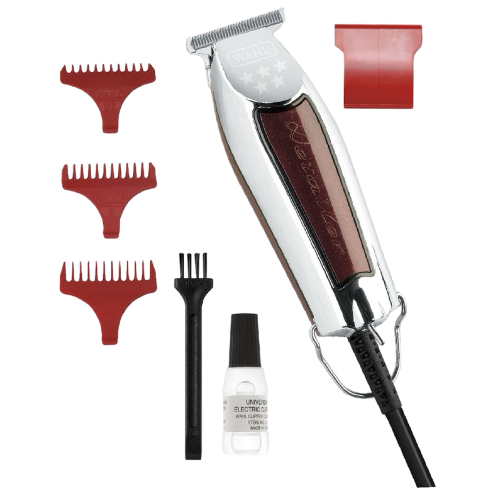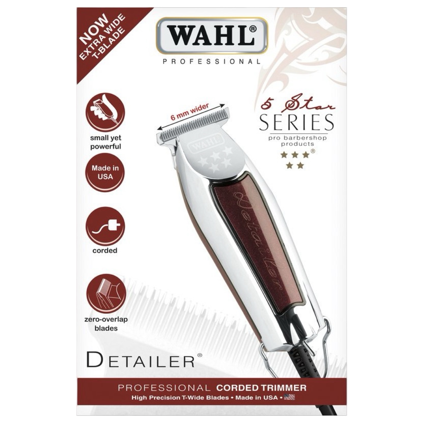 WAHL представляє Вам окантувальну машинку-триммер серії 5 STAR Barber - WAHL EXTRA WIDE Detailer (08081-1216) . Цей приголомшливий невеликий тример оснащений унікальним знаменитим ножем WAHL T-BLADE із збільшеною шириною на 6 мм. Машинка максимально зручна для точної роботи в шийно-комірцевій зоні, оформлення бороди, вусів, детальної стрижки в зоні вух. Ножовий блок виконаний з якісної легованої сталі та має прецизійне заточування.