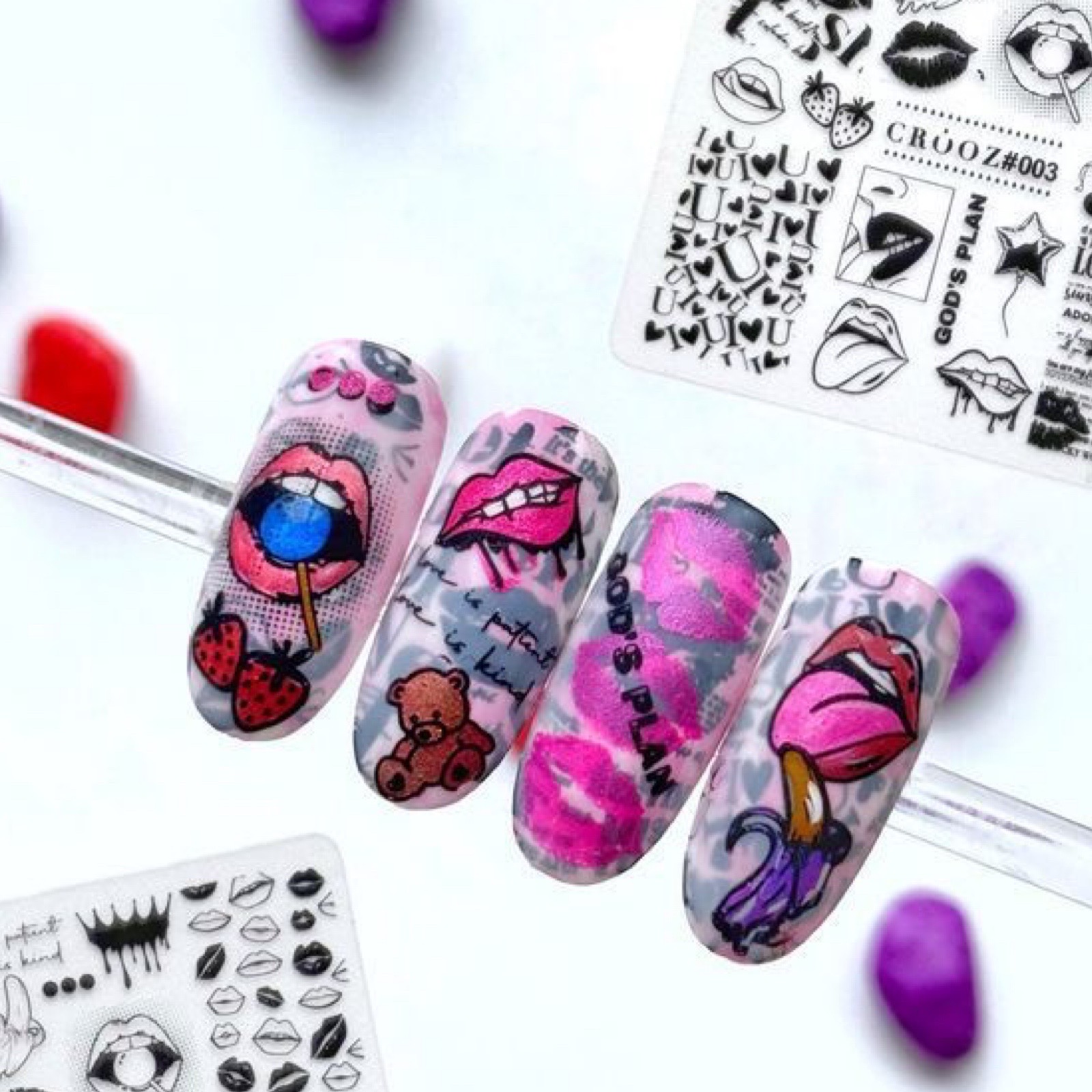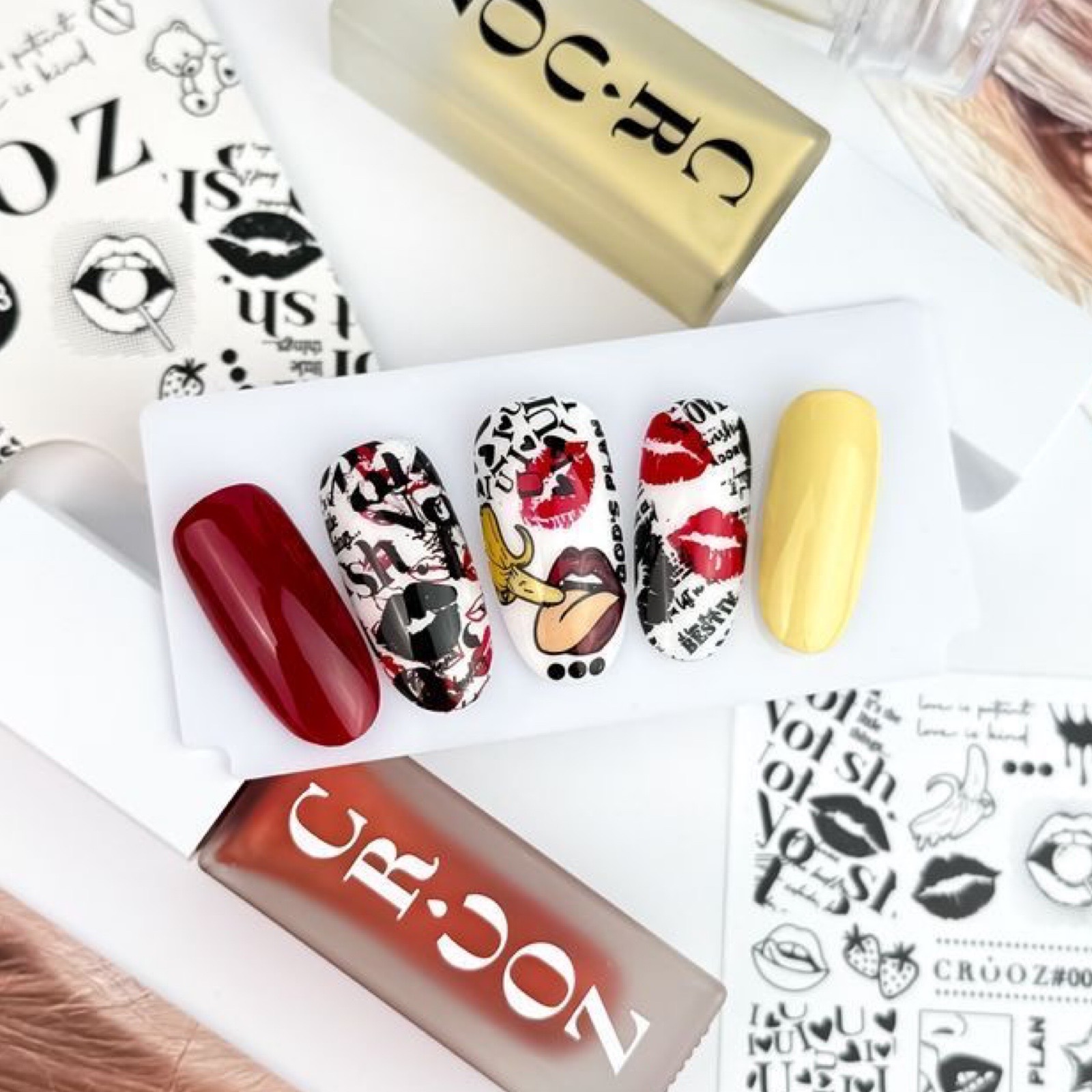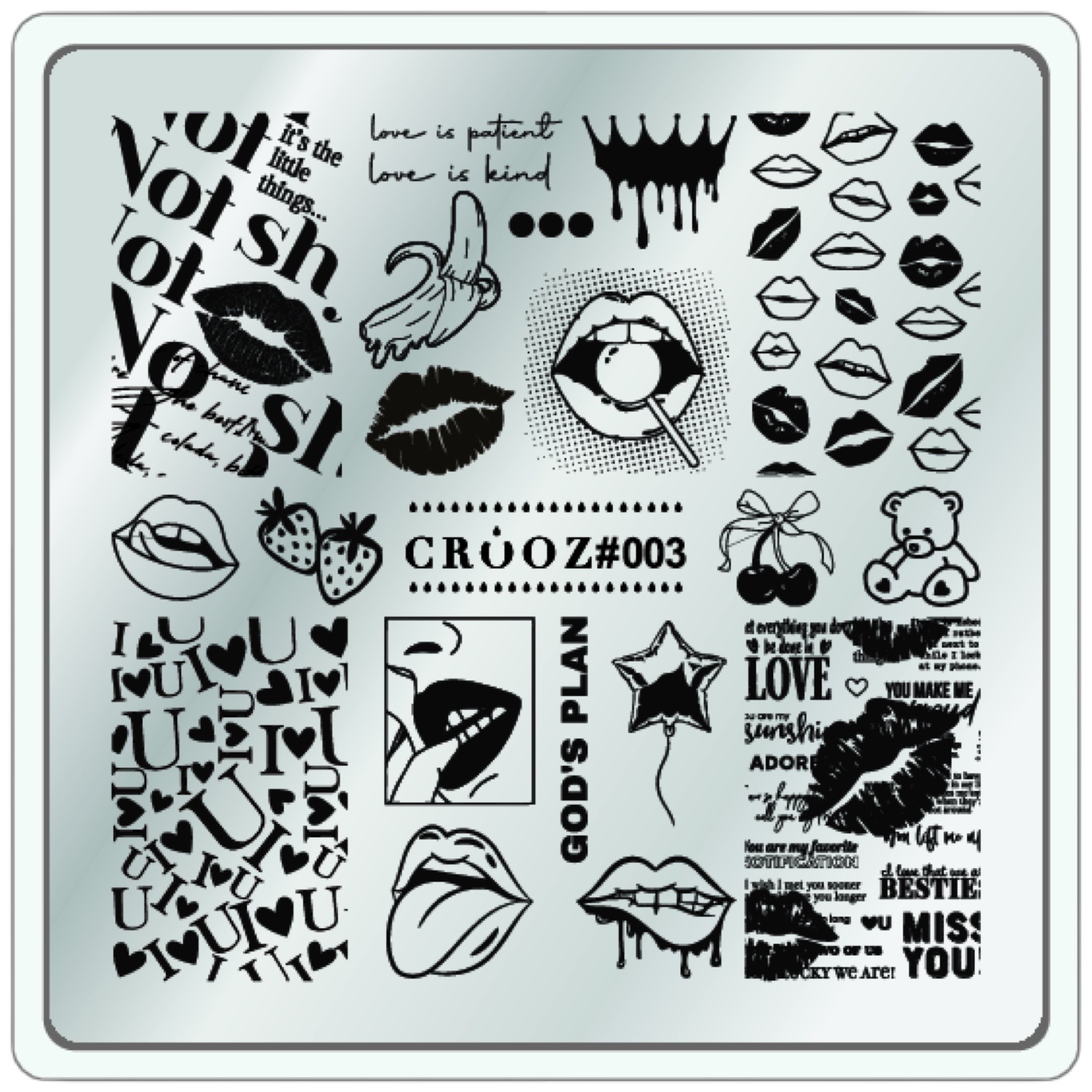 CROOZ #003 Смілива, сексуальна, зухвала. Ця пластина — справжній мікс енергії, почуттів і поп-арту. Сюжет: губи, поцілунки, банани, фрази, сердечка, полуниця, медвежата. Візуальна мова любові — від пристрасті до гри. Написи: love is patient • god’s plan • miss you • no! yes! Для кого: для тих, хто не боїться бути яскравою, сміливою, бажаною.