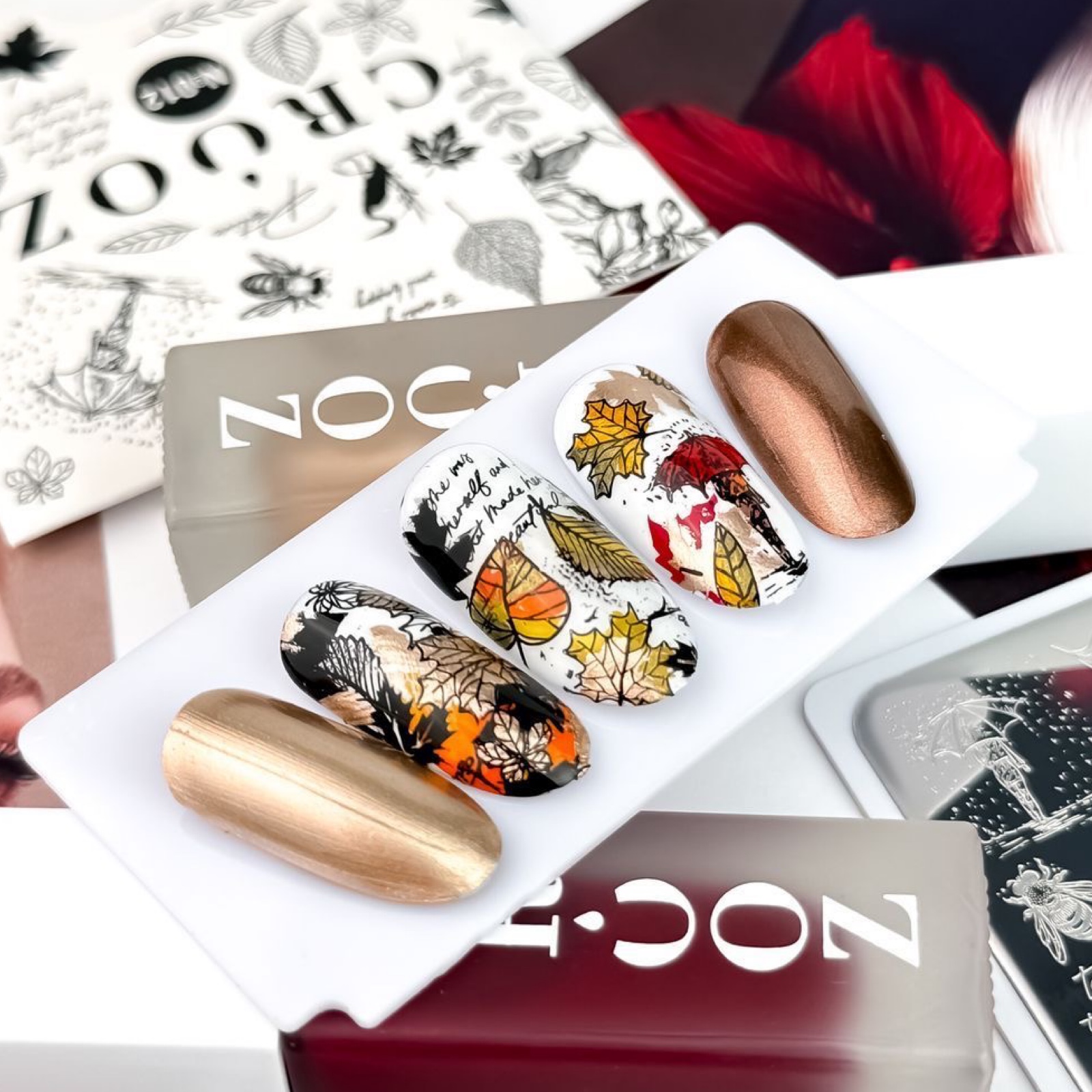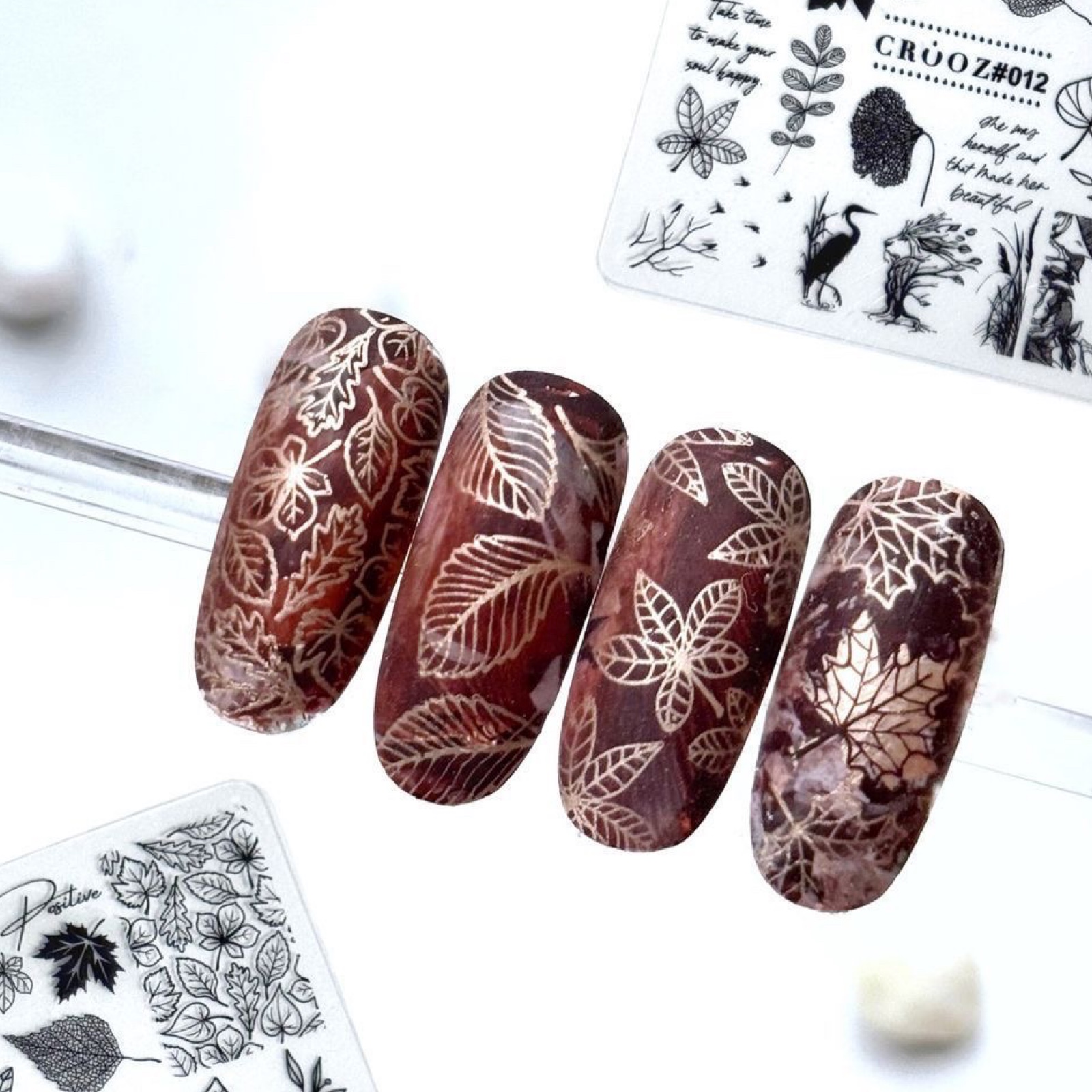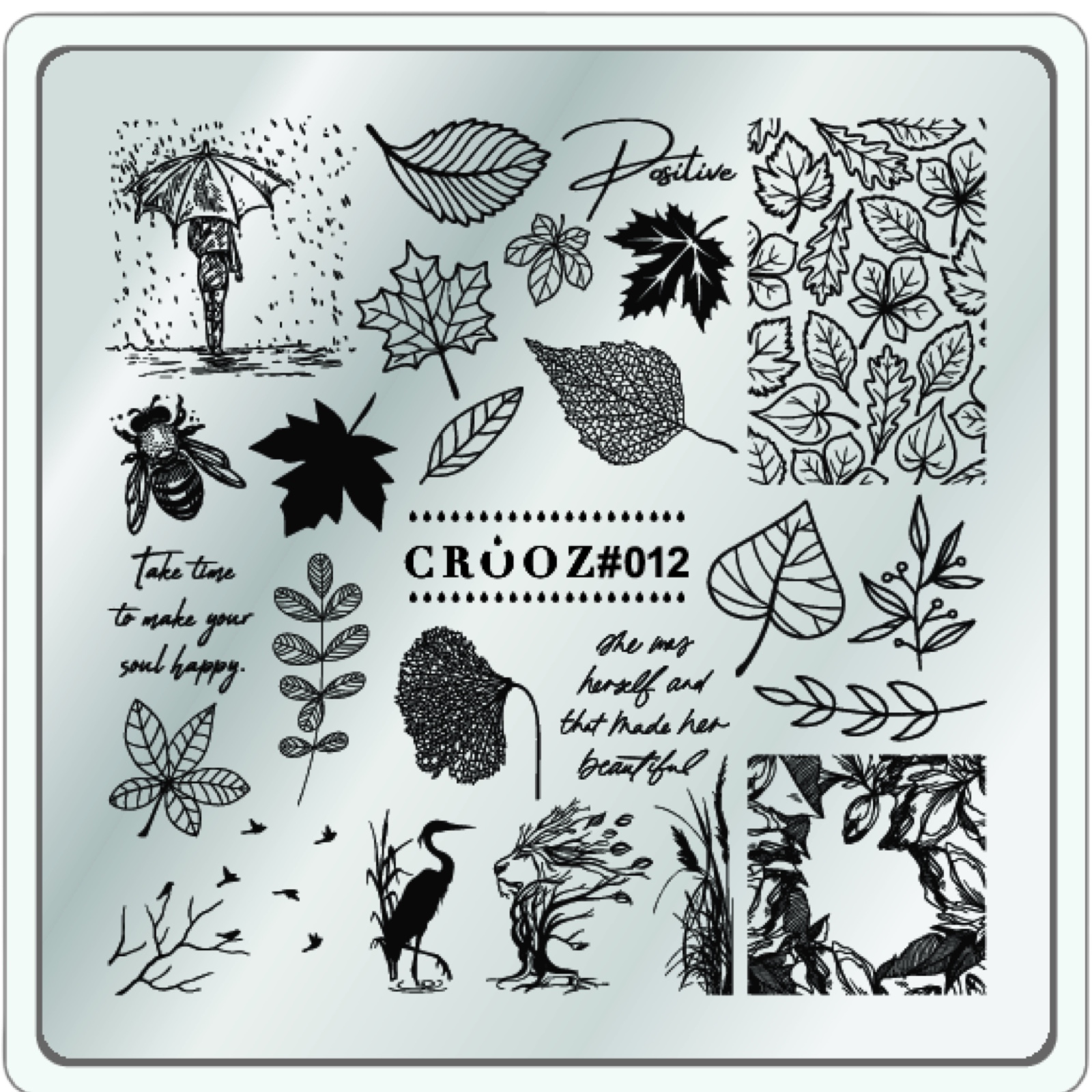 CROOZ #012 Осінній спокій і натхнення природи. Листя, рослини, силуети — ніжна пластина для сезонних і природних дизайнів. Сюжет: різні види листя, гілки, комахи, дівчина в пальто. Написи: take time to make your soul happy • she was brave and that made her beautiful Для кого: для тих, хто любить затишок, гармонію й природну красу.