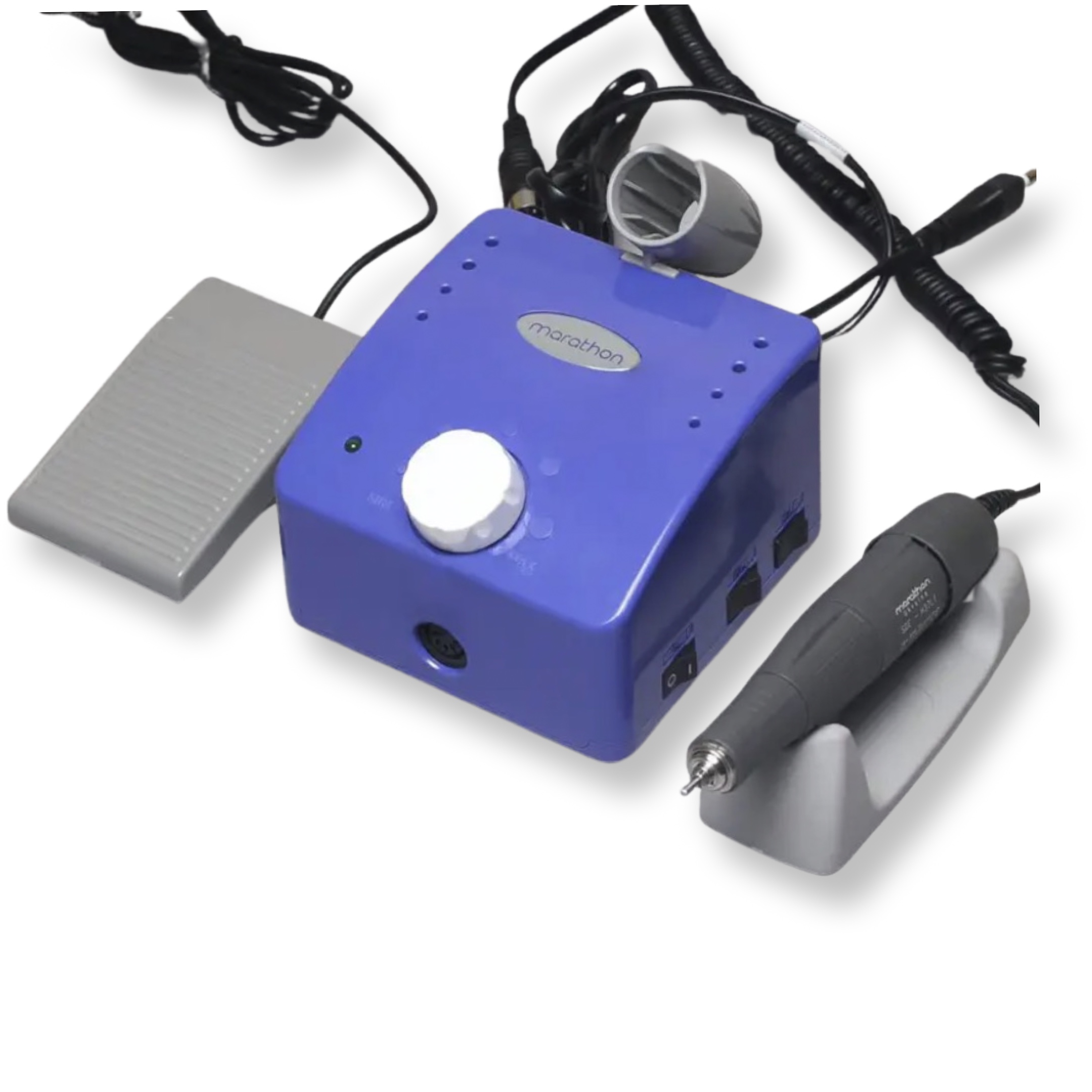 Технічні характеристики блоку фрезера Marathon Cube k-35 аналогічні моделі CHAMPION 3, відмінність тільки в дизайні. На передній панелі стандартно розташована ручка регулювання швидкості. У нижній частині передньої панелі є гніздо для ручки-мікромотора. На бічних панелях розміщені кнопки увімкнення та переходу в реверс. По центру задньої частини є підставка для руки, а отвори фрез розміщені симетрично по 4 штуки на кожному краї блоку. На задній стороні моделі знаходиться кнопка включення ножного режиму та гніздо для педалі.