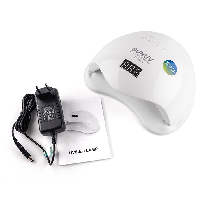 УФ LED-лампа SUNUV Sun 5 Plus має потужність 48 Ватт, оснащена чотирма таймерними режимами (10, 30, 60 та 99 секунд). Може працювати в режимі зниженої потужності 24 Вт (при виборі таймера 99с): сушіння покриттів відбувається більш щадно, без неприємного печіння (дуже комфортно для чутливої шкіри та сухої кутикули). Дисплей дозволяє стежити за часом та контролювати процес полімеризації. Прилад призначений для використання в манікюрно-педикюрних процесах на етапах роботи з гель-лаковими та гелевими матеріалами: створення декоративного манікюру, моделювання, нарощування тощо. При необхідності можна легко зняти дно, щоб полімеризувати декоративні покриття на пальцях ніг. Лампа компактна, досить легка, зручна та функціональна. Її дизайн радує лаконічністю форм та практичністю. Конструкція успішно захищає очі від ультрафіолетового світла. Виробник позиціонує цю модель як універсальний пристрій, що дозволяє сушити будь-які види гелевих матеріалів.