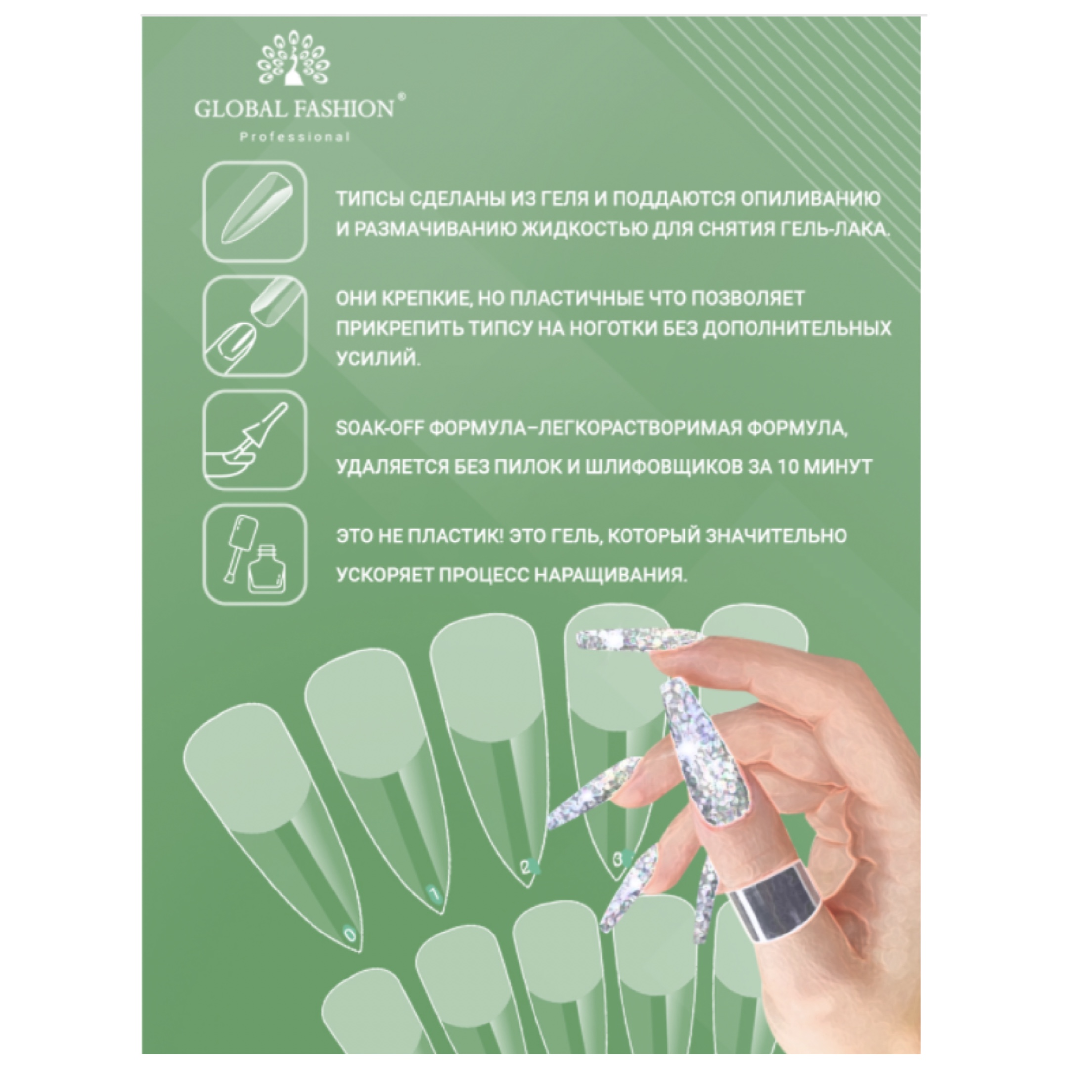 Інновація в нігтьовій індустрії! Тіпси виготовлені з унікального моделюючого гель-полімеру, вони міцні, але пластичні, що дає змогу прикріпити тіпсу на нігті без додаткових зусиль. Важливою особливістю і відмінністю гелевих тіпс від звичайних пластикових є те, що вони тонкі в зоні нігтьового ложа - 0,3 мм, та більш міцні на вільному краї - 0,5 мм. Це забезпечує мінімальний обпил біля кутикули та ідеальну носку. Нігті, нарощені на гелевих тіпсах, вирізняються особливою міцністю і гнучкістю, легко витримують повсякденні навантаження, амортизують під час ударів і ідентичні натуральним нігтям.