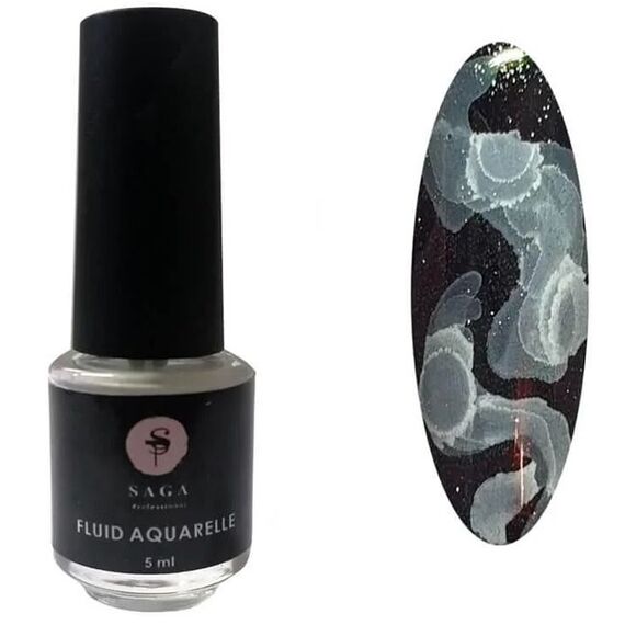 Saga Fluid Aquarelle White – акварельні краплі для дизайну нігтів. Цей приголомшливий матеріал дозволяє створювати легкі та повітряні візерунки у техніці акварельного розпису. Для фону краще використовувати темні тони гель-лаку. Флюїдом можна працювати як тільки по нанесеному топу, по висушеному топу, так і по липкому шару гель-лаку.