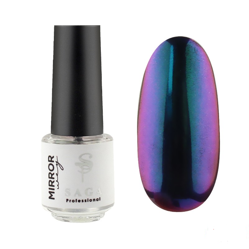 Mirror Way – рідке втирання Saga Professional для ідеальних дзеркальних нейл-дизайнів! Відтепер ніякого пилу! Mirror Way є флюїдом і при цьому має властивість миттєвого трансформуватися в порошок при нанесенні на нігті. Майстру лише залишається легко пройтися спонжиком, щоб надати покриттю дзеркального ефекту. Бездоганно та дуже просто!
