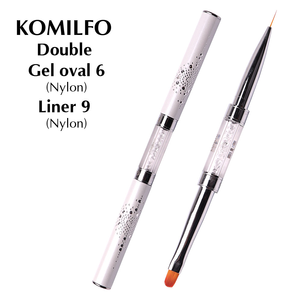 Пензель Komilfo Double Gel oval 6 (Nylon) / Liner 9 (Nylon) - Двосторонній пензель, з одного боку овальна форма пензля дуже зручна, дозволяє набирати і викладати потрібну кількість матеріалу на ніготь, а також наносити його тонким шаром. З іншого боку - це довгий тонкий пензель із синтетичного волокна для малювання тонких довгих ліній. Пензлі з штучною матеріалу особливо рекомендуються для акрилових фарб і роботи з гелем.