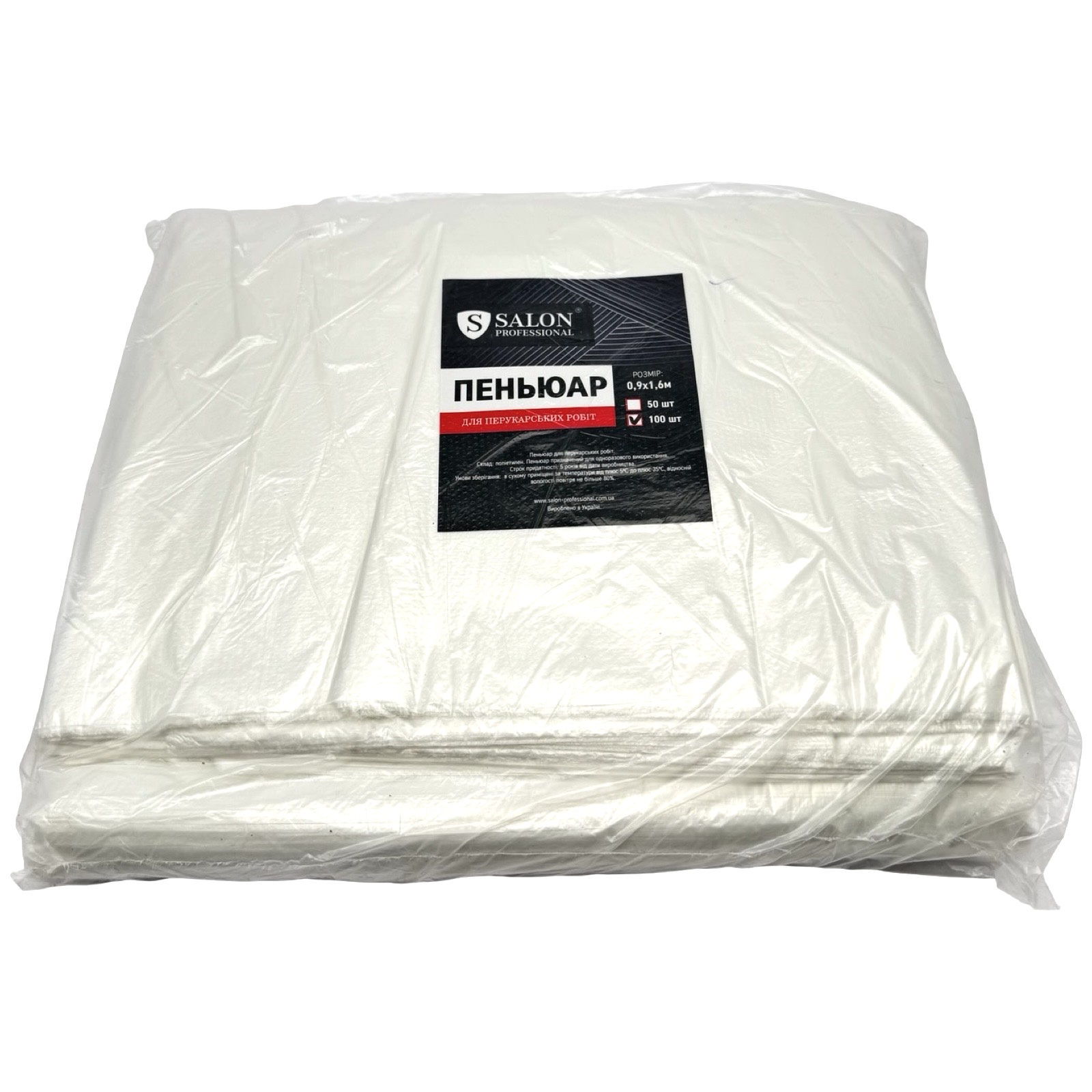 Salon Professional Пенюар білий, 100 шт – це якісний одноразовий пенюар, який ідеально підходить для використання у салонах краси, перукарнях та косметологічних кабінетах. Виготовлений із легкого, водонепроникного та дихаючого матеріалу, пенюар захищає одяг клієнтів від фарби, волосся, косметичних засобів та інших забруднень під час процедур.