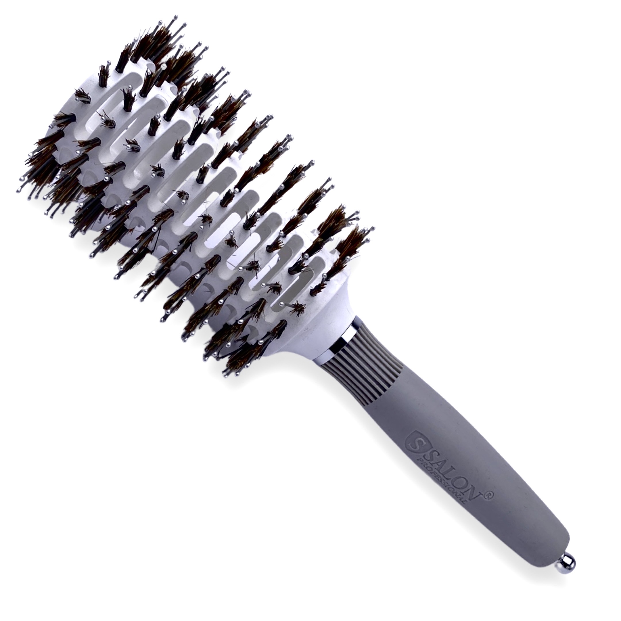 Гребінець "Salon" Брашинг із натуральною щетиною ідеально підходить для якісного розчісування. Використовується для укладання та розчісування нарощеного волосся. Невеликі наскрізні отвори забезпечують потік повітря, для швидкого висихання волосся під час сушіння і укладання феном. Зручна для укладання короткого волосся, а також волосся середньої довжини. Робить волосся гладким, як після застосування праска для волосся. Ідеально підходить для щоденного застосування, розчісування, розплутування волосся й масажу голови. Щетинки не шкодять волоссю й не виривають його.