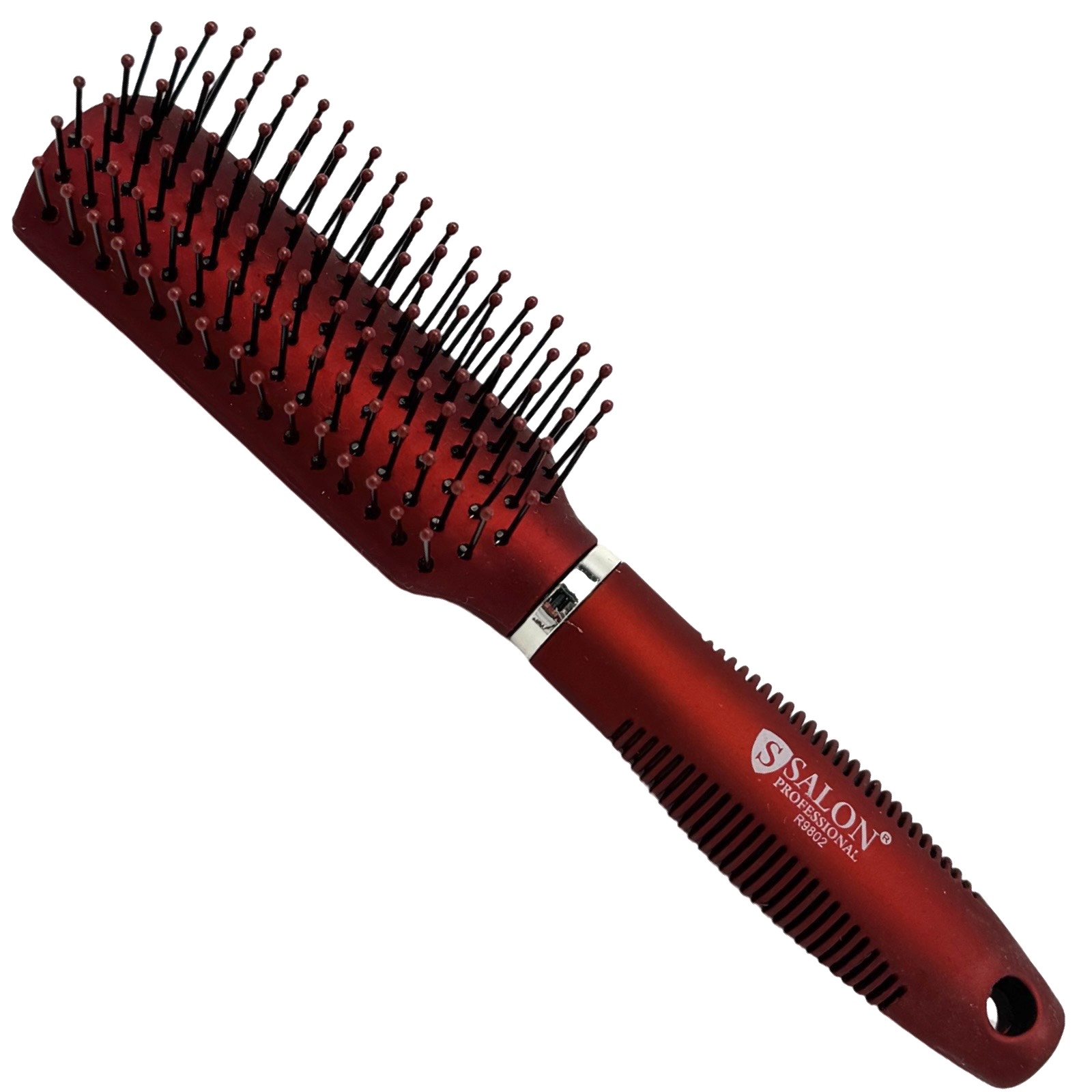 Щітка Salon Professional одностороння тунельна червона, R 9802 – гребінець з тонкими пластиковими зубцями, оснащеними круглими заглушками. Пластикова модель ергономічної форми відмінно підходить як для домашнього, так і професійного догляду, вона не електризує зачіску під час розчісування та укладання. Ручка зі спеціальними рельєфними вставками з боків не ковзає в руці. Перукарський інструмент дбайливо впливає на локони, щетинки легко ковзають пасмами. Виріб масажує шкірний покрив, покращує кровообіг і стимулює зростання нових волосків. Після розчісування зачіска залишається гладкою та блискучою.